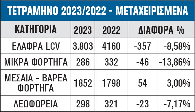 Κάμψη σημείωσαν οι ταξινομήσεις τον μήνα Απρίλιο σε όλες τις κατηγορίες των επαγγελματικών αυτοκινήτων, αλλά η εικόνα του πρώτου τετραμήνου του 2023 παραμένει θετική για τα καινούργια οχήματα, όχι όμως και για τα μεταχειρισμένα.