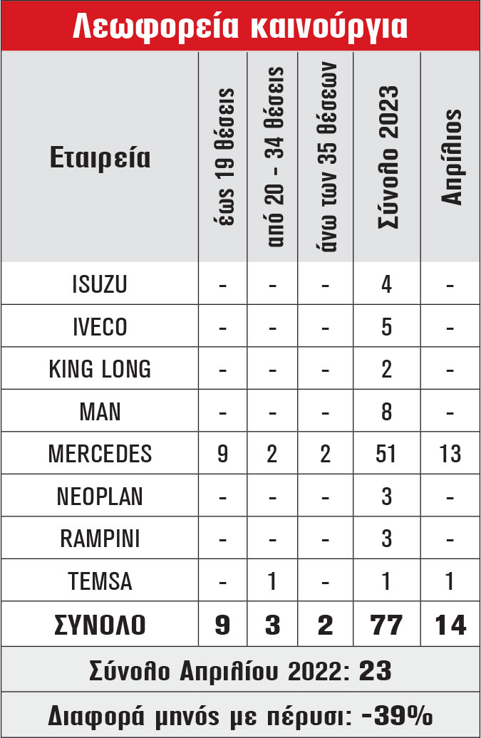 Δεν ταξινομήθηκε ούτε ένα «πενηντάρι» λεωφορείο. Πάντως, πωλήσεις καινούργιων φορτηγών έχουν γίνει αρκετές, όπως πληροφορούμαστε, που σημαίνει ότι κατά το επόμενο δίμηνο θα εμφανιστούν και στους πίνακες των ταξινομήσεων.