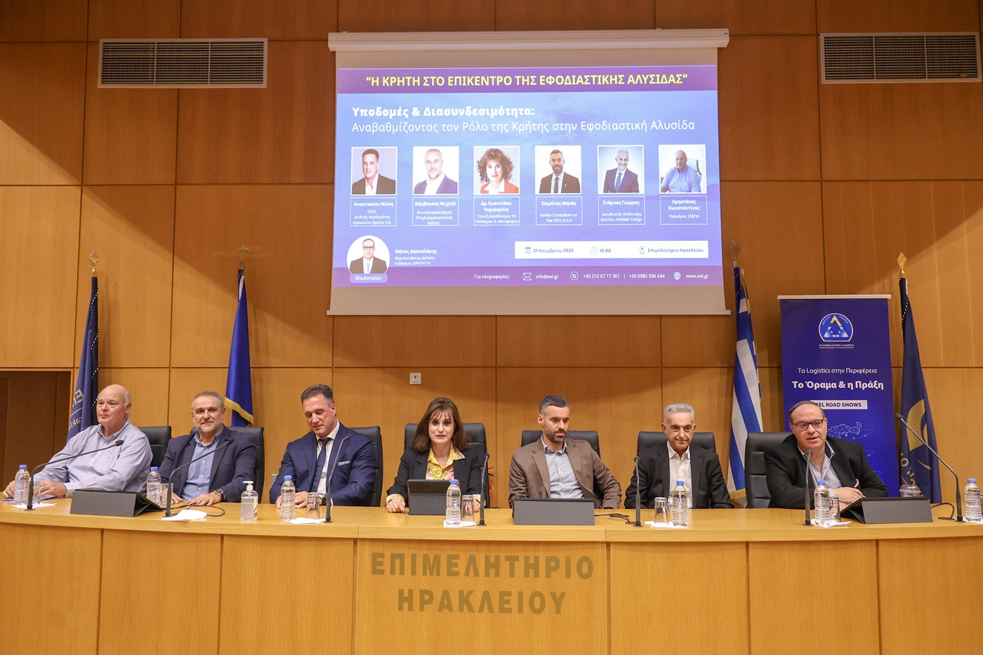 Με ιδιαίτερη επιτυχία πραγματοποιήθηκε την Παρασκευή 21 Νοεμβρίου 2025, στο Επιμελητήριο Ηρακλείου, η επιχειρηματική εσπερίδα με τίτλο «Η Κρήτη στο Επίκεντρο της Εφοδιαστικής Αλυσίδας», που συνδιοργάνωσαν η Ελληνική Εταιρεία Logistics (EEL) και το Επιμελητήριο Ηρακλείου, υπό την αιγίδα της Περιφέρειας Κρήτης και του Δήμου Ηρακλείου.