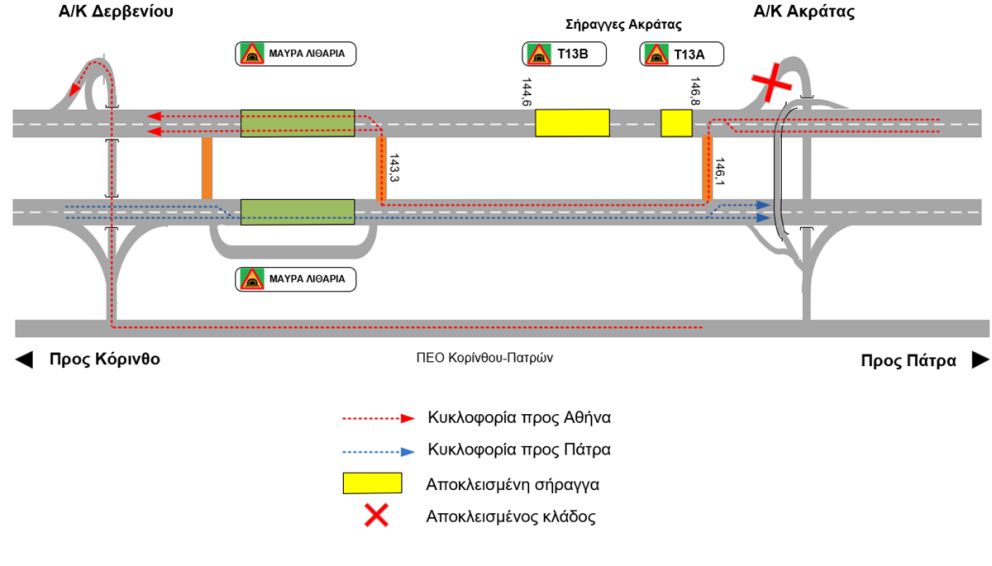 - Αποκλεισμός του κλάδου εισόδου του κόμβου Ακράτας προς τον αυτοκινητόδρομο με κατεύθυνση προς Αθήνα λόγω κοντινής απόστασης της λωρίδας επιτάχυνσης από το Άνοιγμα Έκτακτης Ανάγκης (Α.Ε.Α.) στη Χ.Θ. 146,1. Οι οδηγοί με κατεύθυνση από Ακράτα προς Αθήνα θα εξυπηρετούνται από τον αμέσως επόμενο κόμβο Δερβενίου (Χ.Θ. 140,4).