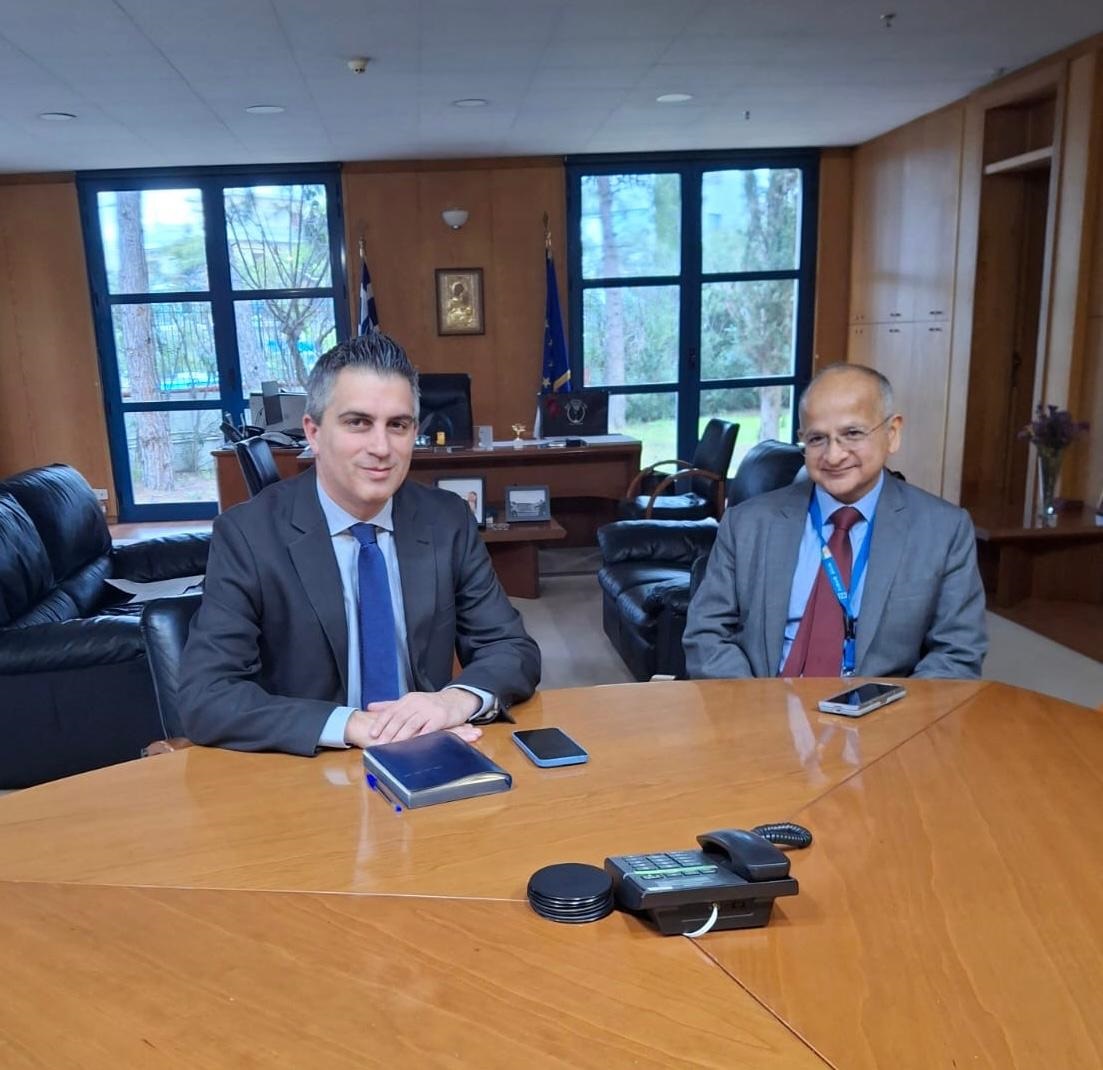 Ο Υπουργός Υποδομών και Μεταφορών Χρίστος Δήμας συναντήθηκε, σήμερα, με τον Πρέσβη της Ινδίας στην Ελλάδα, Rudrendra Tandon, στον απόηχο της επίσκεψης του Έλληνα Πρωθυπουργού στην Ινδία και συμφώνησαν να χαρτογραφήσουν τα βήματα για την εμβάθυνση των διμερών μας σχέσεων, στο πλαίσιο και του IMEEC (India-Middle East-Europe Economic Corridor).