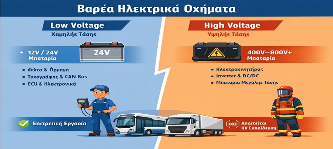 Επισημαίνουμε ότι τα οχήματα υψηλής τάσης (ηλεκτρικά ή υβριδικά), συμπεριλαμβανομένων των βαρέων οχημάτων (φορτηγά άνω των 3,5 τόνων και λεωφορεία), διαθέτουν διακριτά ηλεκτρικά συστήματα:
