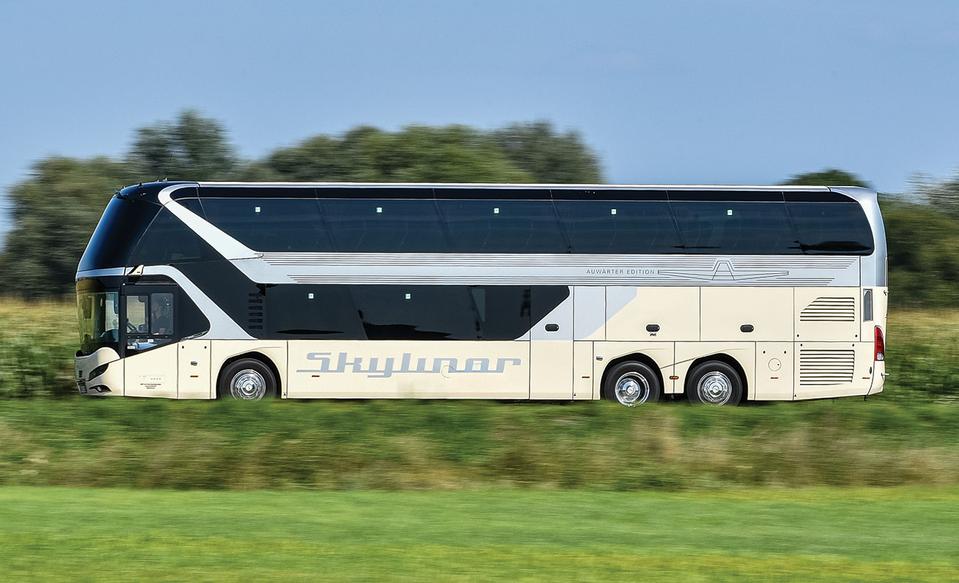 Το όχημα της δοκιμής δεν είναι άλλο από το επιβλητικό σε όγκο και σχεδιασμό Neoplan Skyliner Auwärter-Edition. Πρόκειται για μία σπέσιαλ, επετειακή έκδοση αφιερωμένη στον Konrad Aüwarter –που πρόσφατα γιόρτασε τα 85α γενέθλιά του, και η Neoplan τα 90– δευτερότοκο γιο του Ιδρυτή της Neoplan, και φυσικά οικεία προσωπικότητα σε όποιον έχει μία, έστω γενική γνώση της ιστορίας του κατασκευαστή.