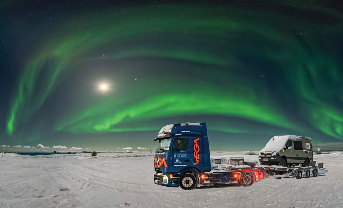 Για το ταξίδι, η ομάδα επέλεξε ένα eActros 600 με μια πλατφόρμα μεταφοράς οχημάτων που μετέφερε ένα Mercedes-Benz Sprinter, έναν συνδυασμό με συνολικό μικτό βάρος οχήματος 32,5 τόνους που χρησιμοποιείται τακτικά στις καθημερινές δραστηριότητες της Vega.