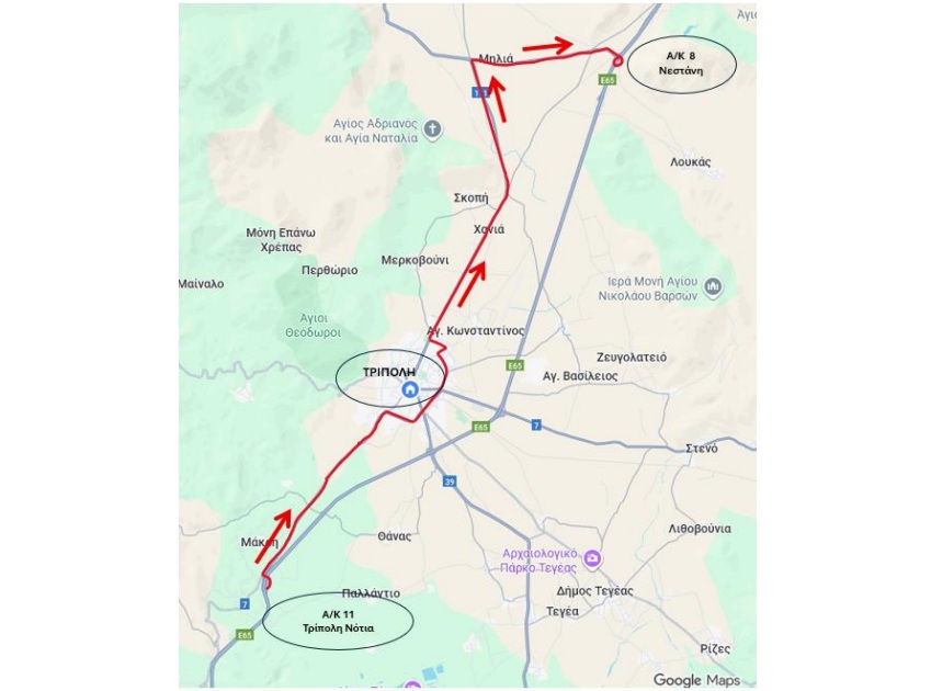 • Εκτροπή της κυκλοφορίας στην κατεύθυνση προς Αθήνα από τον κόμβο Τρίπολης Νότια (Χ.Θ 166+300) έως τον κόμβο Νεστάνης (Χ.Θ 148,1) για διάστημα έως 90 λεπτών εντός της χρονικής περιόδου 06:00-12:00. Κατά την παραπάνω χρονική περίοδο η κυκλοφορία των οχημάτων θα πραγματοποιείται μέσω της Π.Ε.Ο. Καλαμάτας -Τρίπολης, της παρακαμπτήριας διαδρομής Τρίπολης, της Ε.Ο. Τρίπολης - Πύργου και της συνδετήριας οδού Νεστάνης ακολουθώντας τις πινακίδες παράκαμψης. Οι κλάδοι εισόδου προς Αθήνα των κόμβων: Τρίπολης Νότια, Τεγέας, Τρίπολης Βόρεια, και Νεστάνης και των ΣΕΑ Νεστάνης θα παραμένουν κλειστοί. Η κυκλοφορία προς Καλαμάτα δεν θα επηρεαστεί.