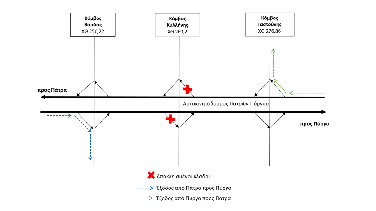 Η κυκλοφορία για το διάστημα αυτό θα εξυπηρετείται από τους γειτονικούς κόμβους της Βάρδας (Χ.Θ. 256,22) και της Γαστούνης (Χ.Θ. 276,86) όπως φαίνεται στο παραπάνω σχηματικό διάγραμμα. Οι κλάδοι εισόδου στον αυτοκινητόδρομο του Α/Κ Κυλλήνης θα λειτουργούν κανονικά.