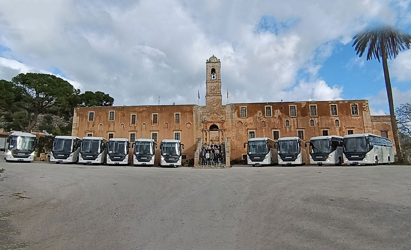 Η παράδοση των 10 τουριστικών Scania πραγματοποιήθηκε χθες το μεσημέρι στα Χανιά με φόντο το ιστορικό μοναστήρι της Αγίας Τριάδας, πολύ κοντά στο αεροδρόμιο της πόλης, με την παρουσία του κ. Χονδράκη, οδηγών και εκπροσώπων της εταιρείας του, του κ. Πέτρου Πλακάκη, διευθυντή της επιχειρηματικής μονάδας φορτηγών και λεωφορείων του Ομίλου Πετρόπουλος, του κ. Παντελή Μαξακούλη, διευθυντή της εταιρείας Σταματίου-Μαξακούλης ΑΕ, του κ. Γιώργου Μαντζούκη, Μηχανικού Πωλήσεων Λεωφορείων και του κ. Γιάννη Παπαγιάννη, Τεχνικού Προϊστάμενου, ο οποίος είχε την ευθύνη της ενημέρωσης των οδηγών σχετικά με τη λειτουργία των Scania Touring και τη χρήση των βασικών συστημάτων οδήγησης.